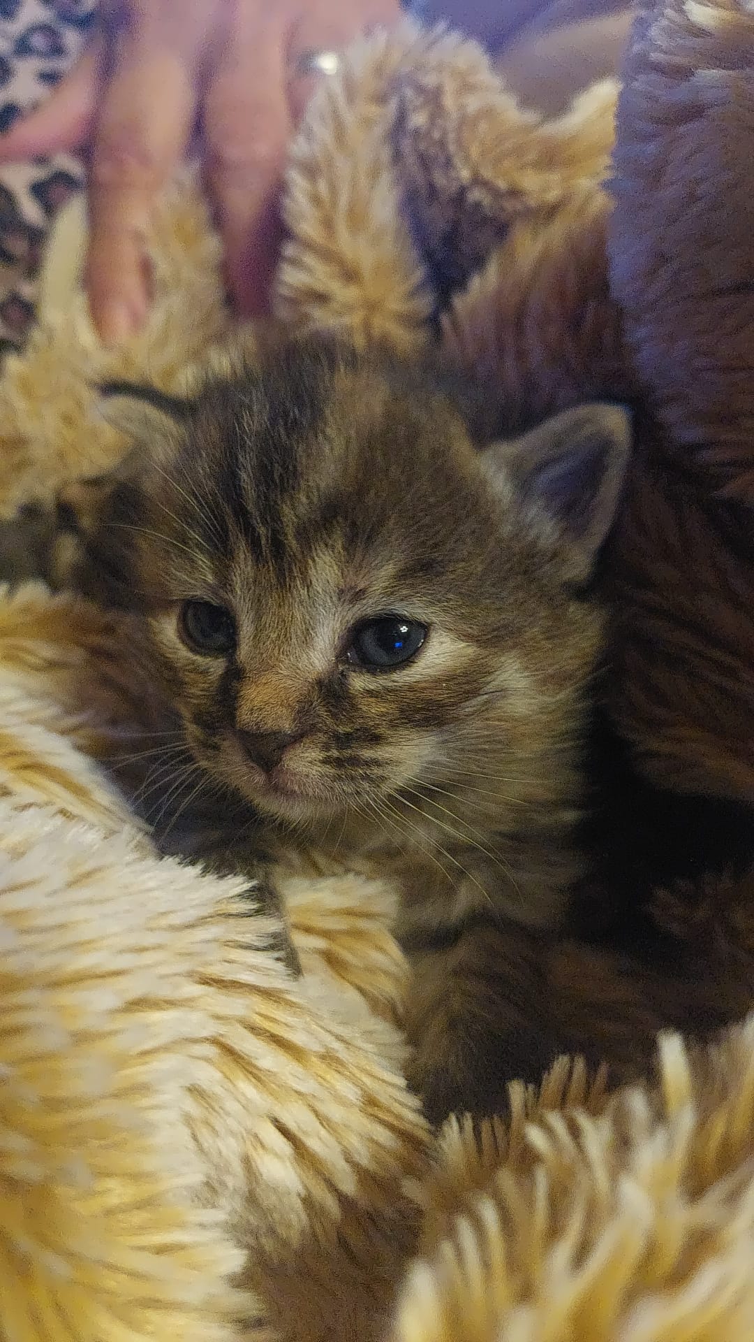 Dit bruingrijs getijgerd kleintje woog 238 g bij binnenkomst en is een kattinnetje