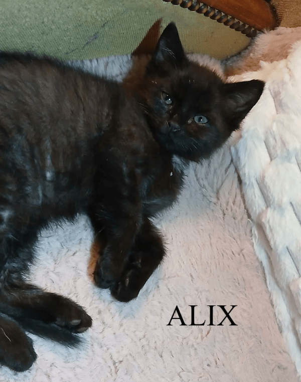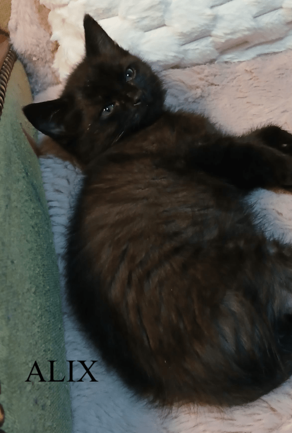 Alix heeft een zwarte vacht met rosse onderschijn en is een heel lief en speels katertje.