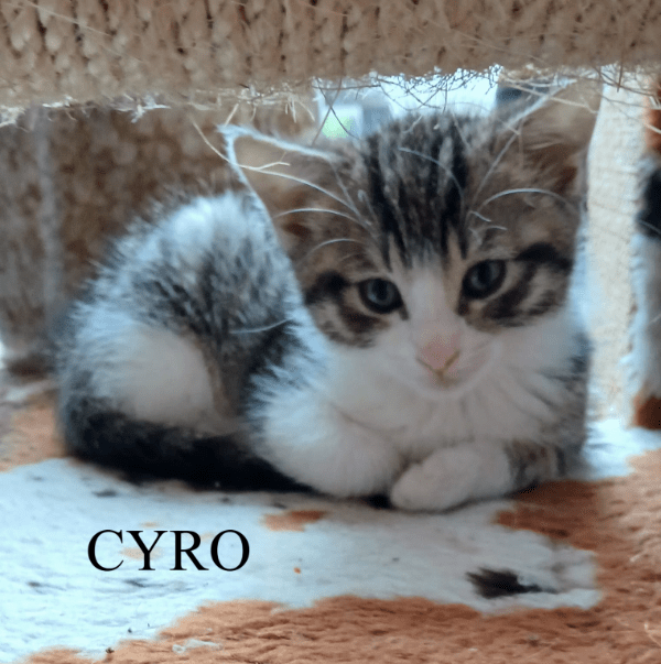 Cyro is grootgebracht met de papfles en heel aanhankelijk en mensvriendelijk. Hij is beste maatjes met leeftijdgenootje Patrick die ook als papflessertje is grootgebracht. Beide kittens worden dan ook niet gescheiden en zijn enkel als duo beschikbaar voor adoptie. Ze voelen zich het best in een rustige omgeving zonder kleine kinderen.
