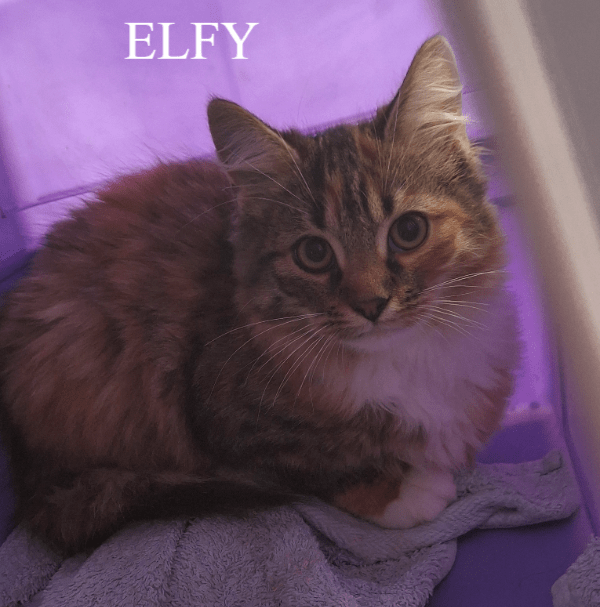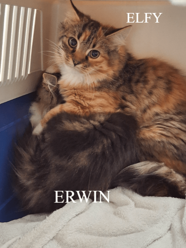Elfy en haar broer Erwin zijn als zwerfkitens ons asiel binnengekomen. Elfy is een heel mooi langharige, driekleurig kattinnetje geboren eind mei maar nog niet zo vertrouwd met mensenhanden. Ze is niet agressief maar nog steeds wat bang en schuchter.dat moet slijten maar daarvoor is tijd en geduld maar ook vooral liefde nodig. Het liefst zou Elfy bij haar broer blijven en wij zoeken dan ook in eerste instantie een warme thuis voor beiden.