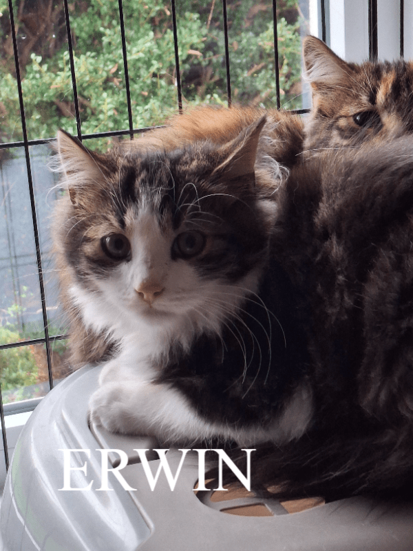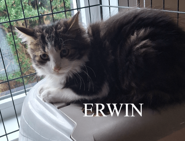 Erwin en zijn zus  Elfy zijn als zwerfkitens ons asiel binnengekomen.  Erwin is een grote tabby pluizenbol met witte accenten,  die al meer vertrouwen heeft in mensen dan zijn zus. In het begin is hij nog wat afstandelijk maar al heel vlug laat hij aaikes toe.Wij willen broer en zus niet scheiden en zoeken dan ook een thuis waar beiden welkom zijn en liefdevol mogen openbloeien.