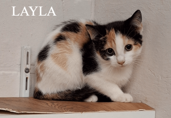 Layla is een mooi driekleurig kattinnetje dat na het overwinnen van haar eerste bange momentjes, geniet van aaikes en knuffels