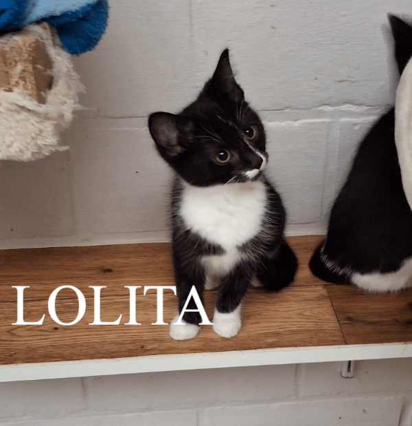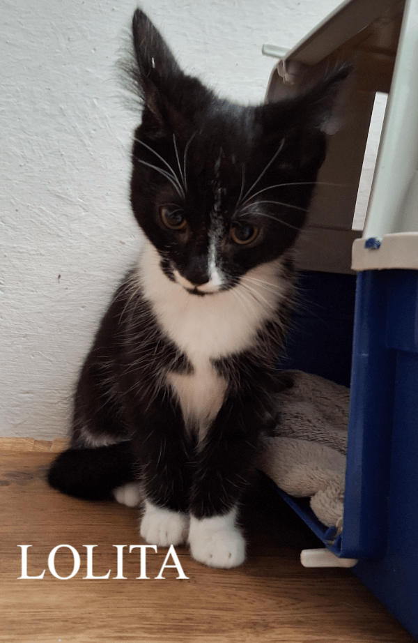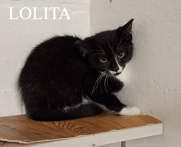 Lolita is een lief zwart-wit kattinnetje dat gekke bekjes kan ztten en zich graag laat aaien waarbij ze kan spinnen als de besten.