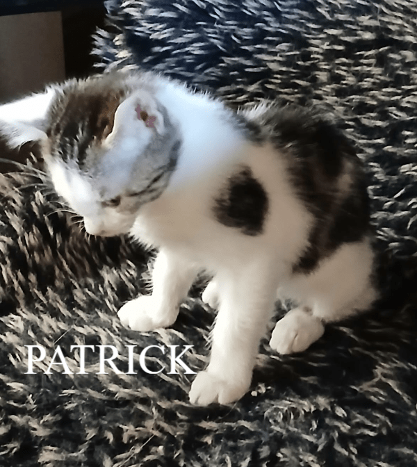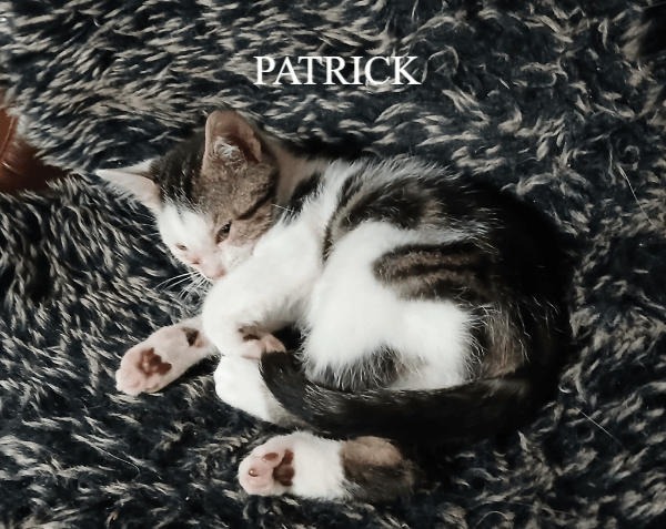Patrick is grootgebracht met de papfles en heel aanhankelijk en mensvriendelijk. Hij is beste maatjes met leeftijdgenootje Cyro die ook als papflessertje is grootgebracht. Beide kittens worden dan ook niet gescheiden en zijn enkel als duo beschikbaar voor adoptie. Ze voelen zich het best in een rustige omgeving zonder kleine kinderen.