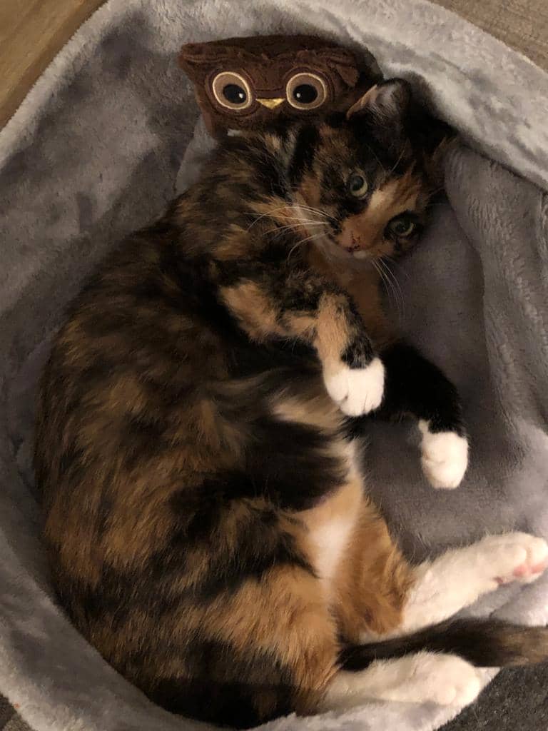 Ik ben wel al even met haar langs de dierenarts langsgegaan want haar wonde zag rood en ze had al paar keer overgegeven. Ze heeft een antibiotica spuit gekregen en één tegen het overgeven. Ze is bijzonder proper. Ze mocht normaal niet te veel eten maar ze heeft dan maar een pakje kattensnoepjes verorbert (in de nacht) en dan mooi het papiertje in haar kattenbak gelegd.. dus echt proper. Zelfs overgeven doet ze in haar bakje.